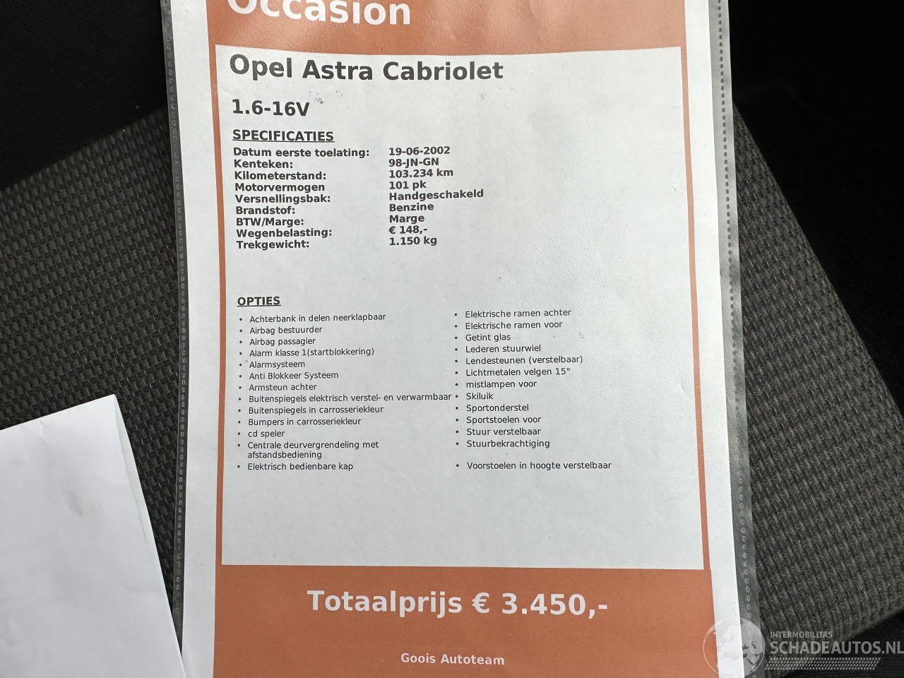 Scherpe meeneemprijs - Deze Opel Astra Cabriolet 1.6i 16v Bertone komt uit 2002 en kostte toen € 26.822 euro. Deze originele Nederlandse personenauto staat sinds 2002 op kenteken