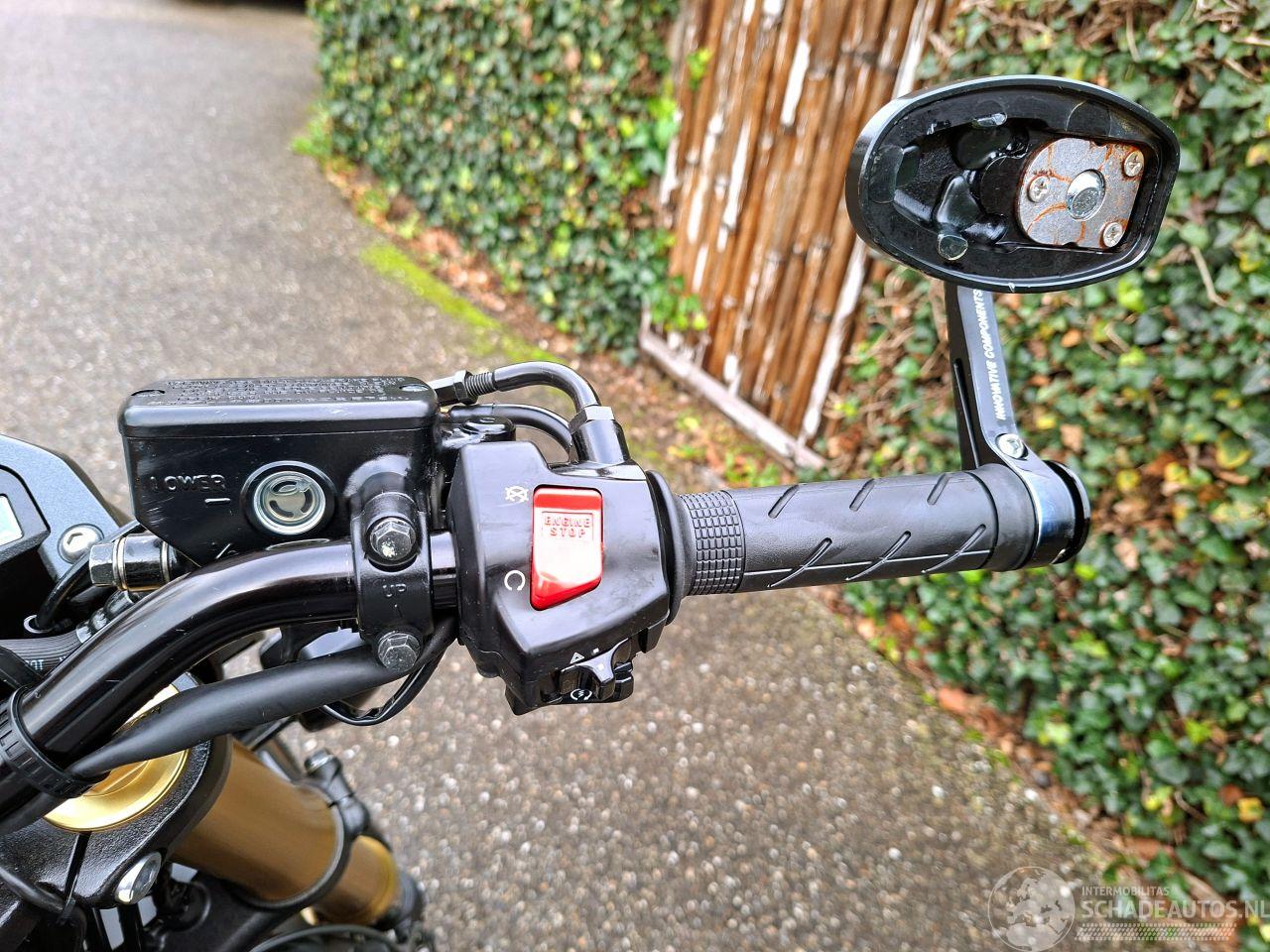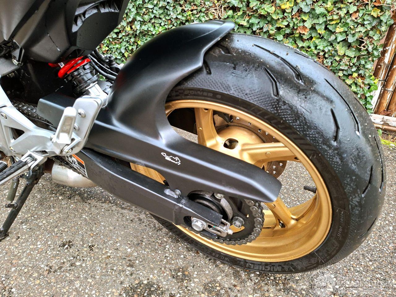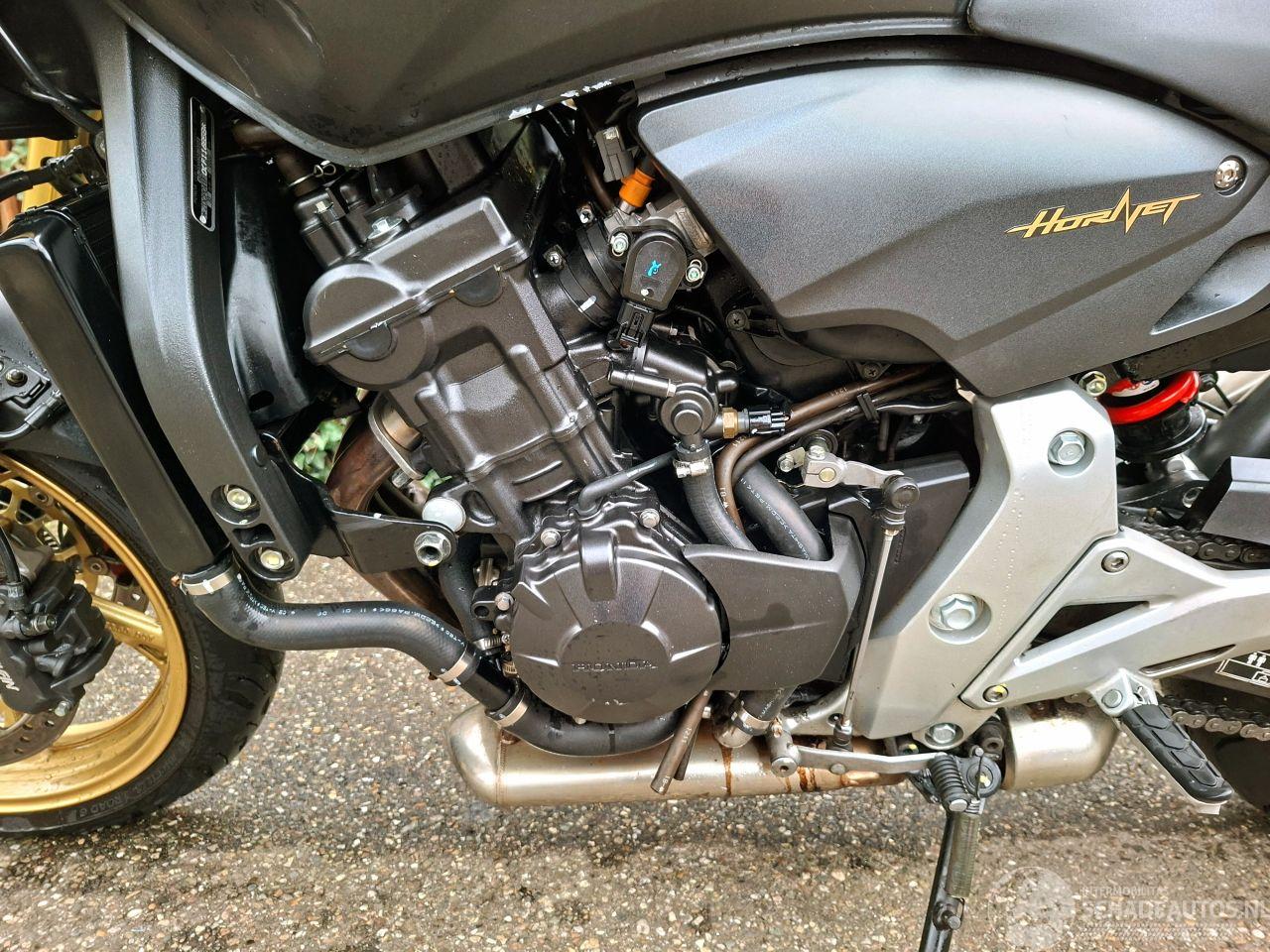 Sportieve Honda CB600F Hornet uit 2012 met 600cc viercilinder blok en naked styling. De matte zwarte uitvoering met goudkleurige velgen en Akrapovic sportuitlaat geeft de motor een strak en agressief uiterlijk. Ideale motor voor wie een speelse en betrouwbare 600cc zoekt met opvallende looks.
