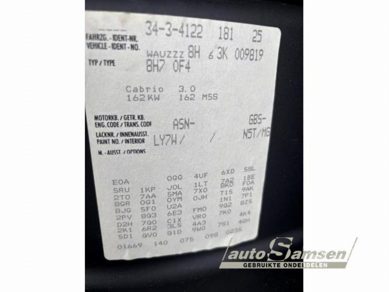 číslo karoserie: WAUZZZ8H63K0*****