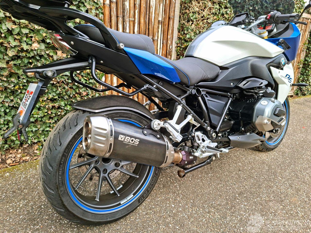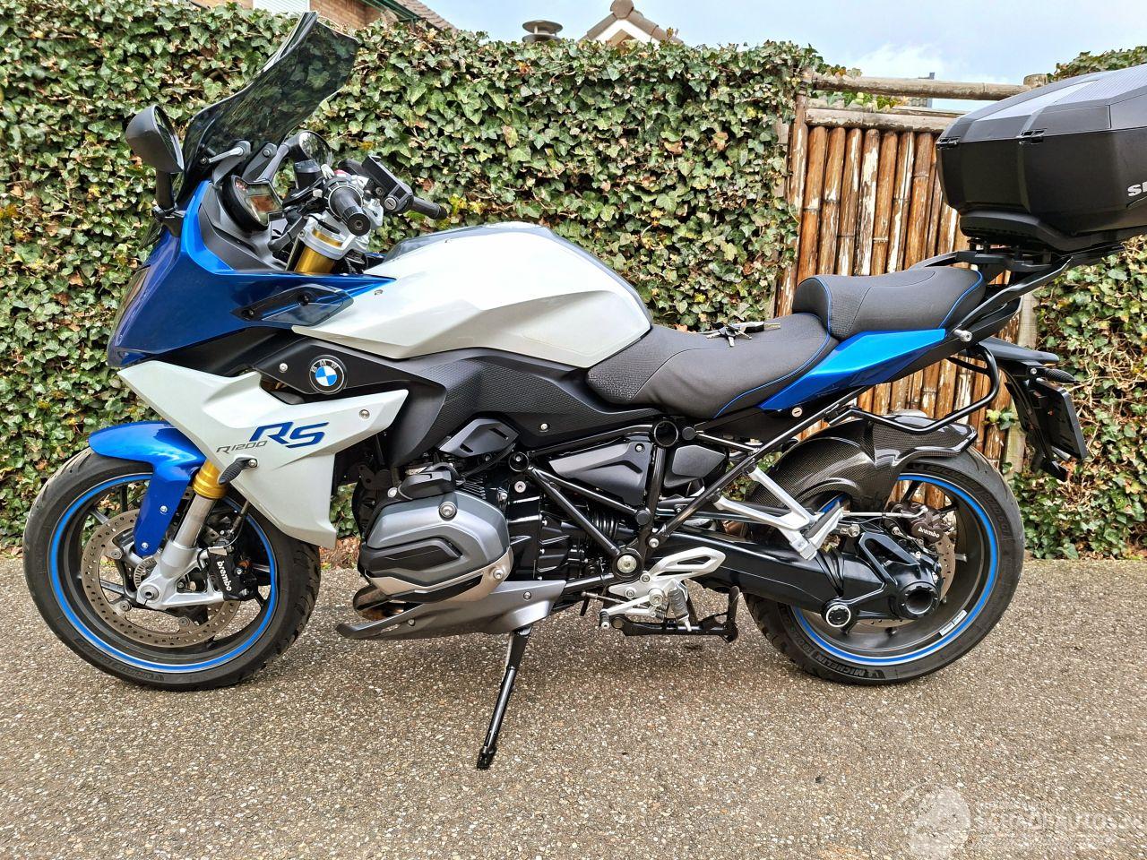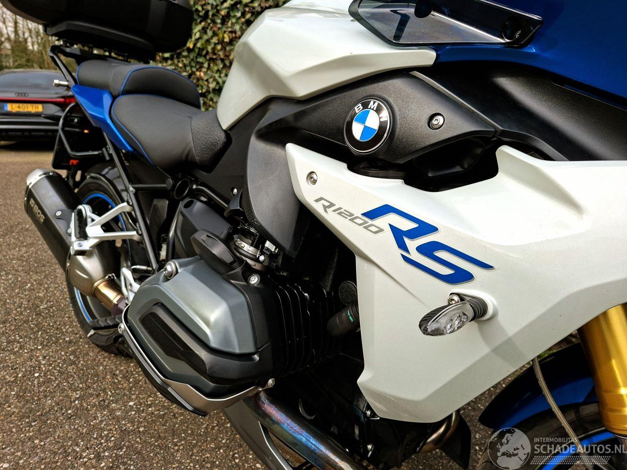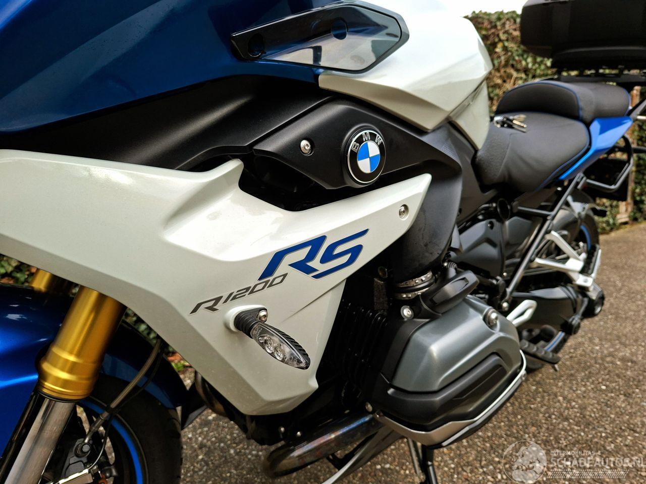 Deze BMW R 1200 RS uit 2015 is een krachtige 1200cc sporttourer met het kenmerkende boxerblok en cardanaandrijving. De blauw-witte uitvoering met Bos performance uitlaat